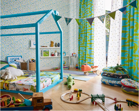 Kita bisa mulai dengan pemilihan warna untuk di dinding, dinding dapat kita gunakan wallpeper dengan motif bentuk binatang. Kemudian untuk jendela kamar si buah hati, kita bisa pilihkan vitrase putih yang bermotif, begitu juga untuk tirainya kita bisa pilih motif binatang seperti buaya yang lucu.