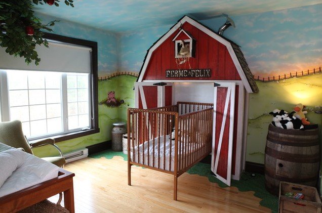 Kamar tidur yang didesign seperti berada di dalam perternakan bisa jadi ide yang menarik. Kita bisa mulai dengan pemilihan cat dinding, untuk bagian dinding bisa kita gambar seperti hamparan rumput yang hijau dan ada gambar binatang yang sedang bermain di hmaparan rumput.