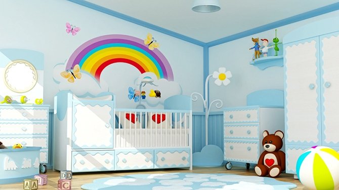 Desain Gambar Pelangi Tema Biru Langit Untuk Kamar Tidur Bayi