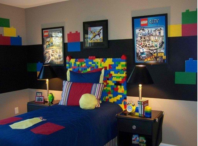 Pada dinding kamar kita bisa memakai bermacam–macam warna karena lego identik dengan menyusun warna. Kemudian dinding ini bisa kita mulai cat dengan warna dasar abu abu. Lalu kemuduan dikombinasi dengan warna hitam serta bagian-bagian tertentu bisa kita beri atau bentuk sususan gambar balok lego dengan cat yang berwarna warni.